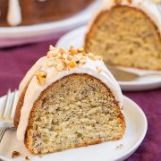 This Banana Bundt Cake is topped with a homemade cream cheese icing and chopped pecans. It’s a dense cake, almost like a pound cake, and is so moist and flavorful!
