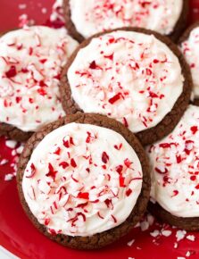 Brownie Peppermint Cookies are minty, sweet, rich with chocolate, and brimming with Christmas flavor! Using boxed brownie mix, these cookies are so easy to make and perfect for a holiday party or Christmas cookie exchange. Fudgy cookies have a light peppermint flavor, then topped with whipped vanilla cream frosting and crushed candy canes make for a fantastic Santa treat.