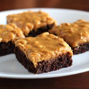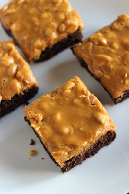 Really how could you go wrong with this kind of combination? Fudgy, chewy, chocolaty brownies topped with a carmely, rich, dulce de leche frosting that’s loaded with lightly salty peanuts that offer just the right amount of crunch and contrast – yes, it’s an irresistible combination. Enjoy!