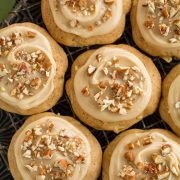 • Spread over cookies (I recommend a fairly thin layer as this frosting is very sweet), and immediately sprinkle with pecans and Maldon (if using. The frosting will set quickly so don't wait to add toppings).