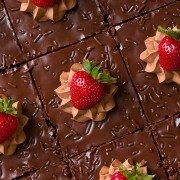 Chocolate Sheet Cake Squares with chocolate mousse and strawberries