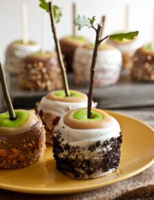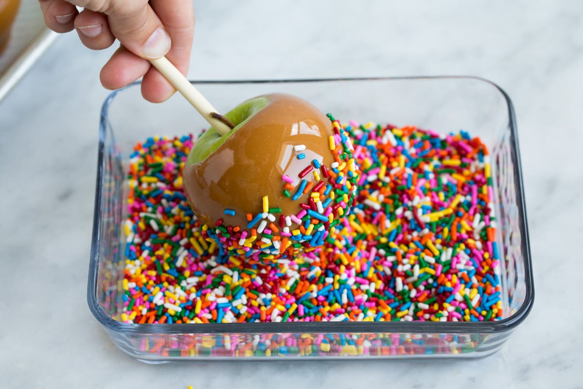 - Lift apple and turn apple upside down to let caramel run up the apple a little, then immediately roll in toppings (or sprinkle with toppings) before caramel sets.