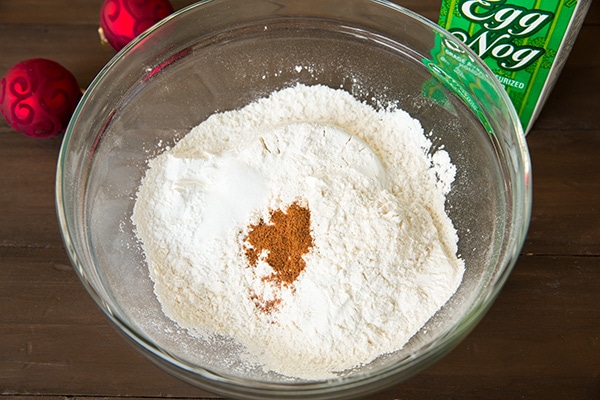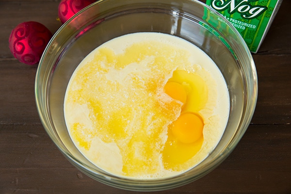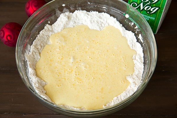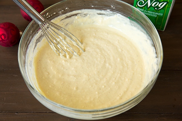 • In a separate mixing bowl, whisk together eggnog, eggs, butter and rum extract until well blended. Pour wet mixture into well in dry mixture and whisk just until combined (small lumps are fine).