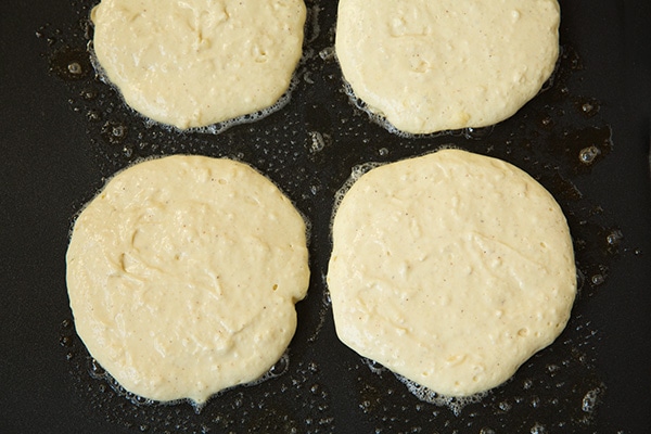 • Pour about a heaping 1/3 cup onto buttered griddle (vegetable oil works fine too if you don't like the fact that the butter can burn quickly), spread batter into an even round (just using the bottom of measuring cup).