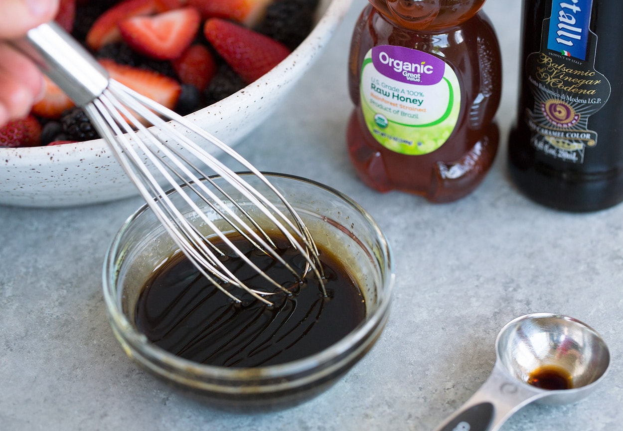 For this fruit salad I chose to go with a Honey Balsamic Dressing because I love the way it compliments berries. Just think about the last time you had strawberries with a balsamic reduction, it’s the same flavor idea here but with lots of berries. It’s so good!