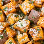 These savory roasted sweet potatoes with the garlic, herbs and parmesan helps balance out and tone down the natural sweetness if you aren’t too fond if it. It just really helps bring some savory flavor to this side dish.