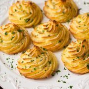 These are mashed potatoes much fancier cousin and they’re sure to impress! They require a little extra time and effort than a batch of mashed potatoes does since they need to be piped out and baked but they are so worth the extra few steps.