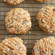 - Preheat oven to 350 degrees. In a mixing bowl whisk together all-purpose flour, whole wheat flour, baking powder, baking soda, cinnamon, optional nutmeg and salt, set aside. In the bowl of an electric mixer, whip together applesauce, butter, brown sugar and granulated sugar until well blended and smooth about 1 minute. Stir in egg and vanilla. Slowly add in flour mixture. Stir in quick oats, carrots, raisins and dried cranberries, mix until combine. Drop mixture by heaping tablespoon fulls onto a Silpat lined cookie sheet two inches apart and bake for 15 minutes until lightly golden and set. Allow to cool several minutes before removing to wire rack to cool. If using glaze: in a small mixing bowl, whisk together powdered sugar and milk until well combine and smooth. Pour into a piping or ziploc bag, snip a small tip off the end and pipe over cookies (note: store cookies in a single layer).