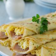They are easy to prepare and they make for a fancy breakfast or brunch. To me they are like breakfast burritos made elegant or something (not that ham and eggs are elegant it’s just that I think crepes are delicate and elegant).