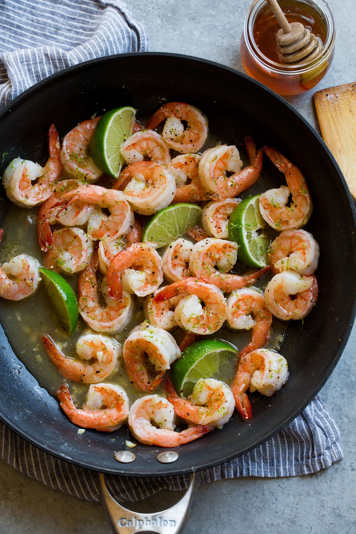 - Pan sear shrimp with sauce: Add shrimp, season with salt and pepper, pour in honey and lime mixture. Spread shrimp out into an even layer.