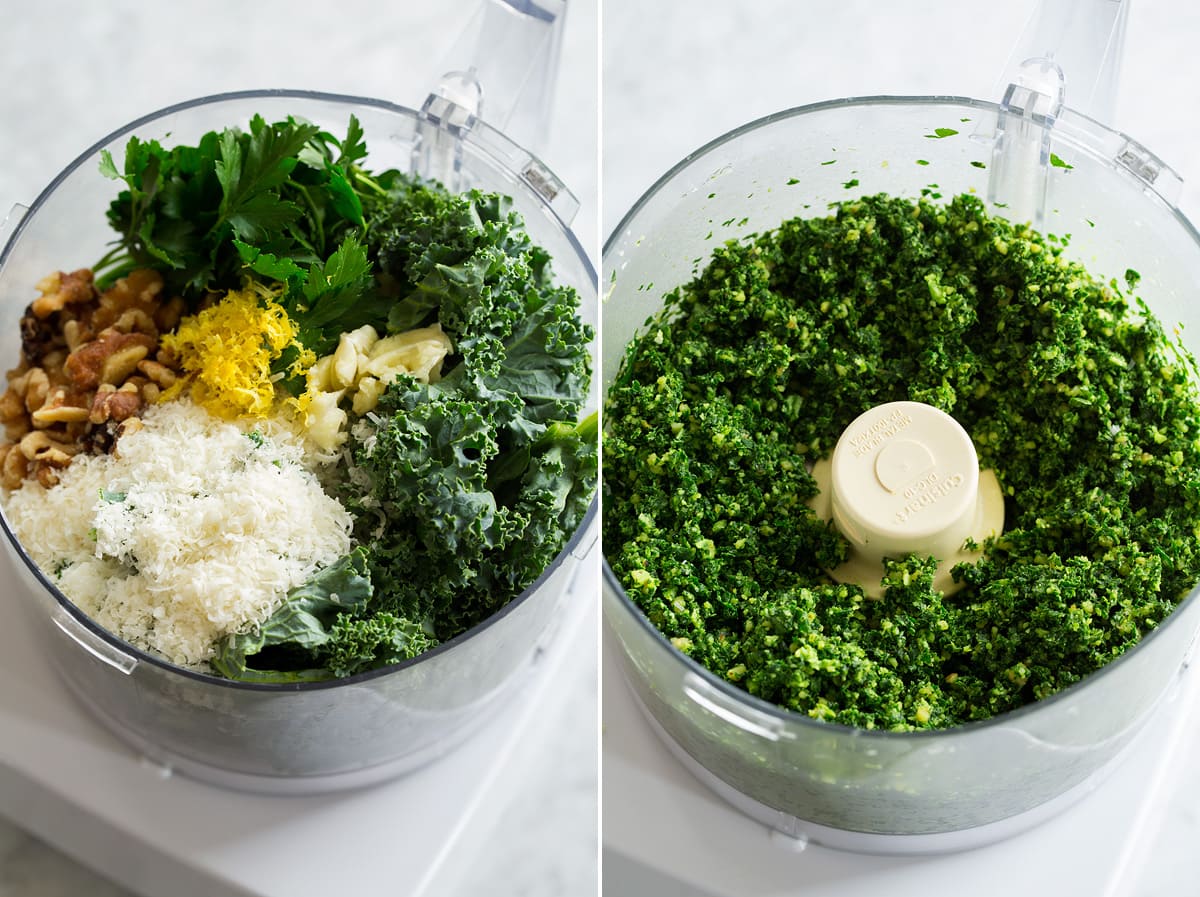 - To a food processor (I use 7 cup size processor) add kale, parsley, parmesan, lemon zest, walnuts, garlic and salt. Cover and pulse until finely minced.