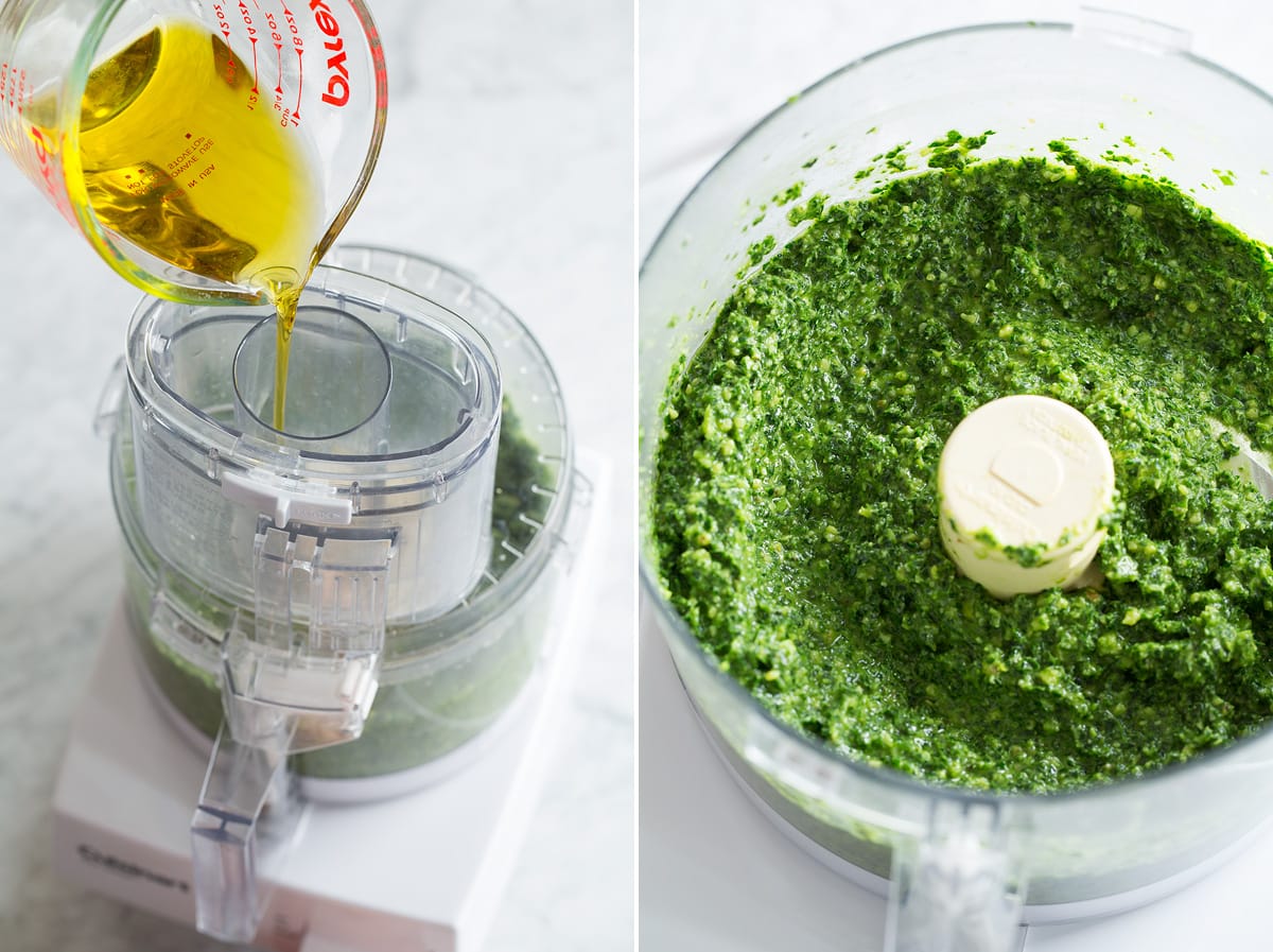 - Cover, then with processor running pour in olive oil through the feed tube of the lid insert.