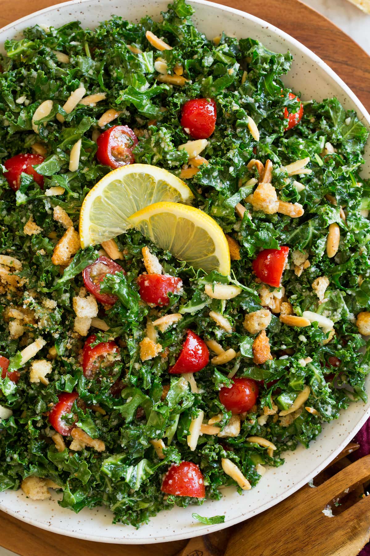 Bright and citrusy Lemon Parmesan Kale Salad – an Italian inspired salad made with nutritious Kale, juicy tomatoes, crunchy almonds and croutons, flavorful parmesan and it’s tossed with a fresh lemon dressing.