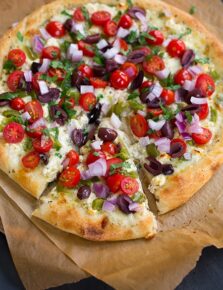 The only drawback to this vegetarian pizza recipe is that you can only bake one pizza at a time unless you have two ovens and two pizza stones. But margherita pizza only takes about 5 minutes to bake, so no problemo.