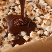 • Remove from oven and sprinkle top evenly with marshmallows then return to oven and bake about 4 minutes longer until marshmallows puff slightly. Remove from oven and allow to cool for 5 minutes then toast tops of marshmallows with a kitchen torch if desired (be very carefully around parchment paper - I lit mine on fire. oops).