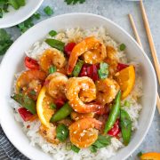 This Orange Garlic Shrimp with veggies is an absolutely perfect shrimp recipe! Aren’t we all always on the lookout for super tasty, easy to follow and easy to make recipes that are packed with flavor, plus a recipe everyone in the family can agree on? This shrimp stir fry fits that description spot on, I’m loving everything about it!
