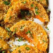 Once you try this delicious roasted butternut squash recipe you’ll be hooked! The crisp Panko bread crumbs and salty parmesan pair so well with the soft and buttery squash flesh, and the herbs and garlic just give it that extra boost of flavor through perfect roasting and rich ingredients. I think you could replicate this recipe with a spaghetti squash or acorn squash, too.