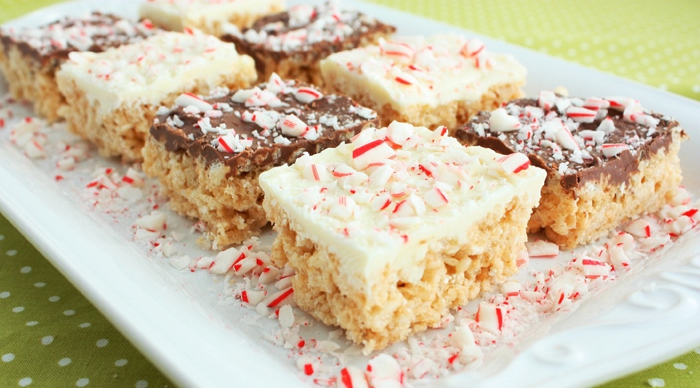 Put an exciting festive twist on a favorite classic with these Peppermint treats. They are one of my favorite treats! I think they may even be the treat I give to neighbors this holiday season. Think peppermint bark combined with chewy Rice Krispie treats and what you get, these! Just to forewarn you, you’ll have a hard time eating just one. PS Did I mention these treats are quick and so easy?