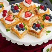 Puff Pastry Fruit Tarts with Ricotta Cream Filling are fluffy, light, and the perfect canvas for summer fruits at the peak of berry season! Flaky store-bought puff pastry creates a pillow for rich whipped ricotta cream, dotted with juicy, brightly-colored fruit that will be the biggest hit at any summer gathering. Make these for a baby shower menu or fancy brunch!