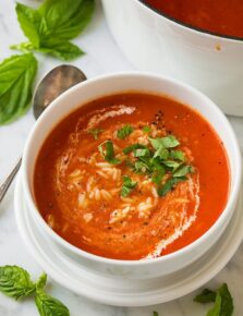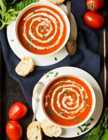 Is there a soup that says summer like a homemade roasted tomato basil soup does? In this version we oven roast the tomatoes, onions and garlic for more depth of flavor and it really makes the soup over-the-top delicious!