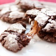 I love the idea of of biting into what you think is a standard chocolate crinkle cookie, with chewy chocolate dough and sweet dusted powered sugar, only to delightfully discover a melty bomb of salted caramel hidden in the middle! It’s a huge hit for a Christmas cookie exchange because it’s different from the usual suspects, and always a pleasant surprise.