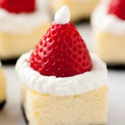 Santa Hat Cheesecake Bites are made with chocolatey Oreo cookie crust, a decadent white chocolate cheesecake filling and finished with a fresh strawberry and sweetened whipped cream. Festive and so delicious—beloved by kids and adults alike!