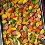 - Remove baking sheet from oven (at this point there should be a little excess oil on the baking sheet if not you can drizzle over another 1 Tbsp), add sliced sausage and bell peppers and toss everything.Â