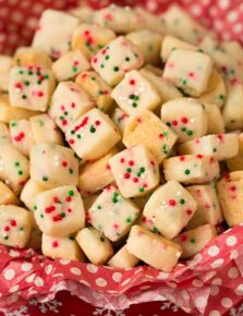 Colored sugar, crystal sprinkles, or jimmies will work great here. Nonpareils add a bit of a crunch, fine sugar sprinkles will add a faint crunch and jimmies will be soft. If using colored sugar you’ll likely only need 1/2 cup since they’re finer.