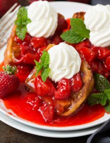 This can also be made into a smooth syrup if you don’t like the texture. After it’s cooked, just blend it up in a blender in batches (with the middle insert removed from the lid and covered with a folded kitchen towel) and strain through a fine mesh strainer or sieve for a smooth consistency. It’s similar to a strawberry simple syrup that you can use with so many delicious recipes. Use strawberry syrup as a strawberry sauce in: