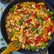 Szechuan Chicken Stir-Fry — A hearty chicken stir fry packed nutritious veggies. It’s tossed with a flavorful, spicy sauce and finished with peanuts for a nice crunch. Serve with white, brown or cauliflower rice.