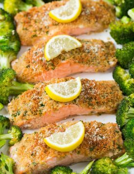 One Sheet Pan Parmesan Crusted Salmon with Roasted Broccoli