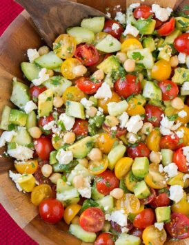 Tomato Avocado Cucumber Chickpea Salad with Feta and Greek Lemon Dressing
