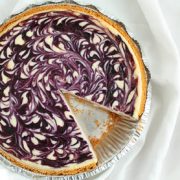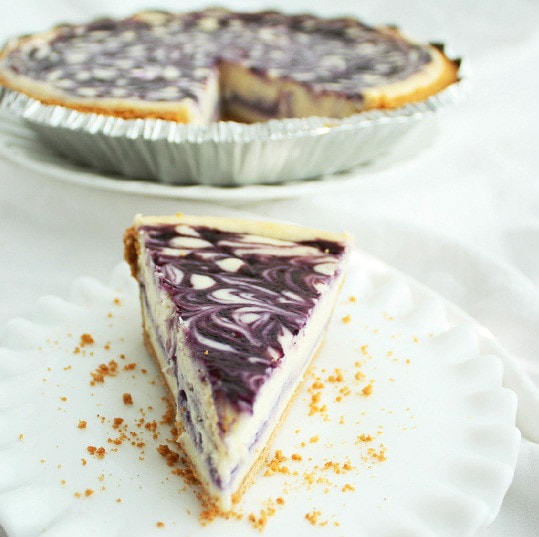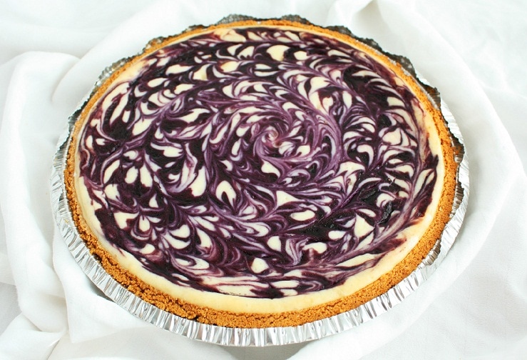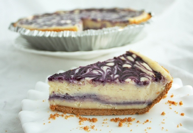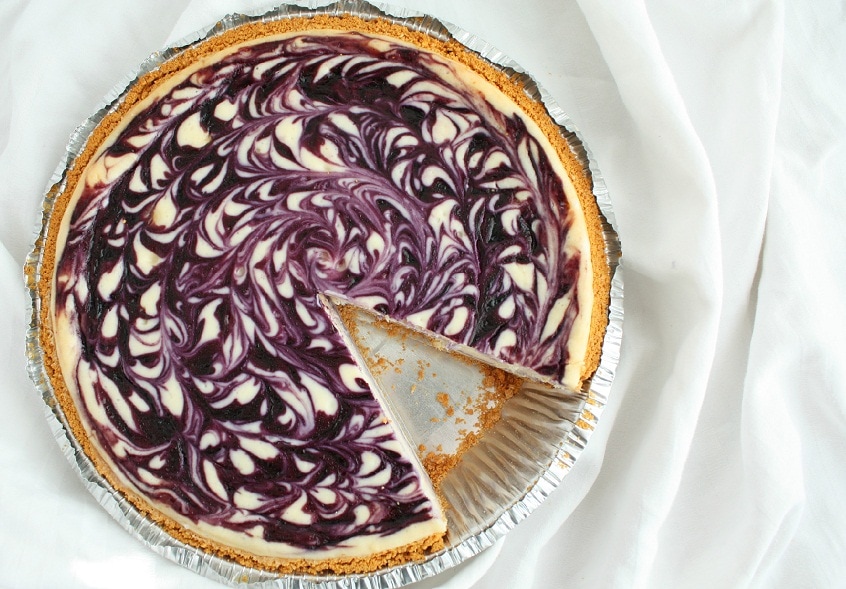 This White Chocolate Blueberry Cheesecake is incredibly easy to make. It starts with a pre-made graham cracker crust and is swirled with a homemade blueberry sauce. A crowd favorite every time!