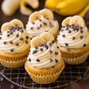 A moist and delicious chocolate chip studded banana cupcake. Finished with a rich cream cheese frosting for even more decadence! A great way to use up overripe bananas.