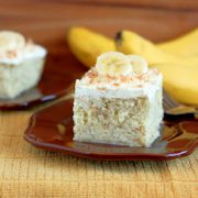 Preheat oven to 350 degrees. Butter the bottom only of a 13x9 baking dish. In a large mixing bowl, combine cake mix, water, vegetable oil, eggs and mashed bananas. Using an electric mixer, beat ingredients on low speed for 30 seconds then increase speed to medium and beat for 2 minutes, scrapping down the sides of the bowl frequently.