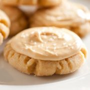 Allow to cool several minutes before transferring to a wire rack to cool. Cool completely then frost each cookie with Salted Caramel Frosting and sprinkle each cookie evenly with a small pinch of sea salt immediately following (so the salt sticks before frosting sets). Store cookies in a single layer in an airtight container.