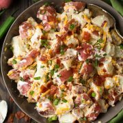 Such an easy flavorful potato salad recipe! Just cook potatoes in boiling water, drain and toss with ranch, cheese and green onions. A new summertime staple!