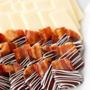 Place 2 oz white chocolate candy melts in a microwave safe bowl and heat in microwave on 50% power in 30 second intervals, stirring after each interval until melted and smooth. Transfer mixture to a small resealable bag, and cut a small tip off of one corner. Drizzle melted white chocolate coating over chocolate covered bacon. Transfer to refrigerator until white chocolate has set. Store in refrigerator in an airtight container.