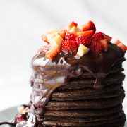 Truly decadent, soft and fluffy Chocolate Pancakes that are perfect for a holiday or weekend breakfast! Finish them with chocolate ganache and fresh fruit for an over the top treat. Makes about 12 pancakes.