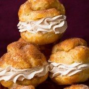 Transfer whipped cream into a pastry bag fitted with a small round tip. Using a knife pierce the side of each cream puff to create a hole. Insert the pastry tip into the hole and fill with cinnamon whipped cream.
