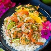 Skillet cooked shrimp is tossed with bright lime and fresh cilantro then served over a bed of rich coconut rice. The perfect tropical meal!