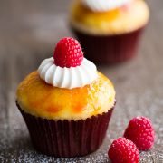 Allow topping to cool then garnish with whipped cream and a raspberry if desired. Serve immediately (note: the pastry cream can be made the day before and the cupcakes can be made hours ahead of time but top with sugar and caramelize sugar just before serving).