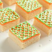 Spread orange frosting evenly over entire sheet of "cookie" then cut into squares (cookies). Scoop green frosting into a Ziploc bag and seal bag. Then using scissors cut a tiny end off one of the edges of the Ziploc bag (start tiny when cutting because this will determine the size when piping, you can cut more after testing the size of the pipe, if desired.) Then pipe diagonal lines in one direction over each cookie (see photos below), then repeat this processes making diagonal lines heading the opposite direction. Outline the edge of each cookie with green frosting. Sprinkle each cookie square with white sprinkles. Store cookies in an airtight container.
