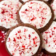 A decadent perfectly peppermint Christmas cookie! You get a rich brownie-like cookie base topped with a rich cream cheese frosting. Then they're finished with peppermint candies for a pretty festive color.