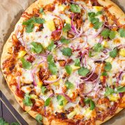 Such a tasty pizza recipe! Pizza crust is layered with smokey bbq sauce, chicken pieces, creamy mozzarella, sweet pineapple, and flavorful red onion and cilantro.