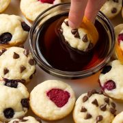 Spray each well of two 24 mini muffin cup pans with non-stick cooking spray. Fill each muffin well about 2/3 full (a heaping Tbsp into each. I have a 1 1/2 Tbsp cookie scoop and filled it nearly full). If adding toppings, add 4 blueberries in each, or 1 raspberry, or scant 1 tsp mini chocolate chips. If doing cinnamon sugar topping, once the plain muffins are done, brush tops lightly with melted butter, remove from pan and immediately roll in cinnamon sugar (these taste like churros!).