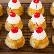Place a wire cooling rack over top of muffin pan and flip to invert onto wire rack. Let cool completely then pipe sweetened whipped cream over cupcakes just before serving and top with a maraschino cherry.