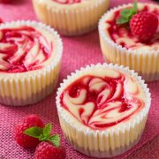 Jiggle pan to level cheesecake filling then dollop about 5 small circle of raspberry sauce over each cupcake, about 3/4 tsp total over each one. Using a toothpick, swirl raspberry filling with cheesecake mixture to create a marbled design.