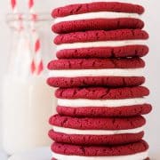These are beautiful decadent cookies that are perfect for holidays or parties. All the classic flavors of red velvet cake in sandwiched, cream filled cookie form!