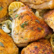 Preheat oven to 400 degrees. Rub both sides of each chicken thigh with cut side of garlic halves, set aside and reserve garlic, then sprinkle each of chicken side with salt and pepper.